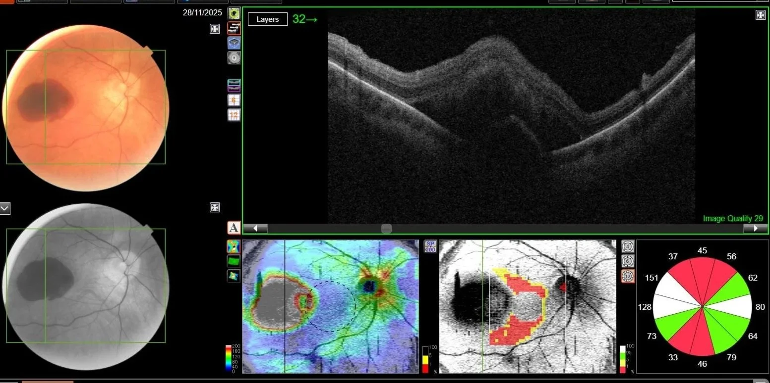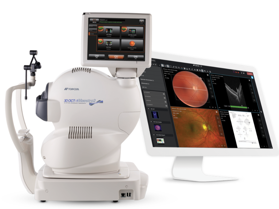 The OCT machine captures both a retinal photograph and a retinal scan of the back of the eye, allowing us to rapidly diagnose a number of common eye conditions (i.e. macular degeneration, glaucoma and diabetes).